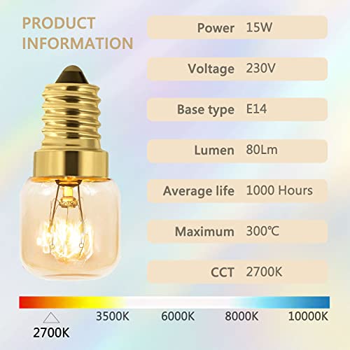 ΔToepassing: door de productie van speciale, hittebestendige materialen is de ovenlamp bestand tegen hoge temperaturen tot 300 °C! Perfect voor zoutlamp, afzuigkap, oven, magnetron of andere apparaten met E14-lampfitting.