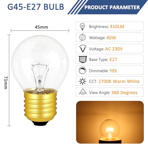 Specification: Caldarax 2 stuks ovenlampen G45 40 W E27, dimbaar, 2700 K, warm witte gloeilampen, 410 lumen, 71 mm x 45 mm, tot 300 °C hittebestendig, G45 240 V globe, heldere gloeilampen voor oven, lava-lamp