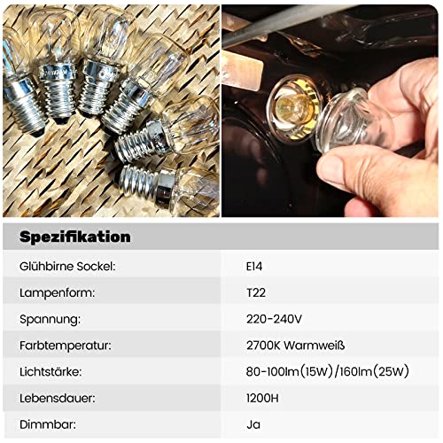 FOXNSK 6st Ovenlamp 25W 300 graden, E14 T22 230V Ovenlamp, Dimbaar, 160lm, 2700K Warm Wit, 1200h, Ovenlamp Led voor Zoutlamp Koelkast Naaimachine Kerstster