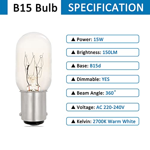 Specification: Gloeilamp SBC Pygmee B15d 15 W dimbaar AC220-240 V, 150 lm, warm wit, 2700 K, bajonet, kleine sokkel B15, T22, transparante bajonetlamp voor naaimachine, 3 stuks