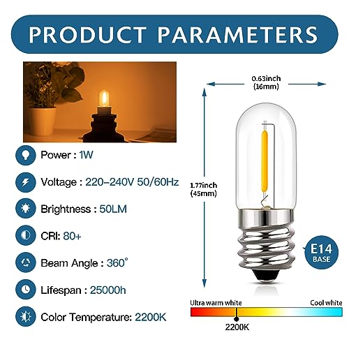 💡Kleine E14-lamp: 220V-240V, 50 lumen, 360 graden stralingshoek, LED-lamp straalt amberkleurig licht van 2200K uit om een romantische sfeer te creëren.Met beveiliging tegen overbelasting, kortsluiting en oververhitting