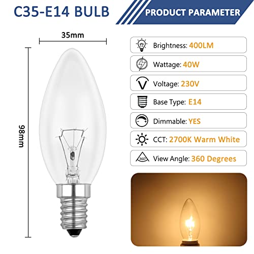 Δ【Afmetingen】6 stuks x E14 heldere 40 W, kaarsvorm C35, Edison E14 schroeffitting, eenvoudig te installeren. Spanning 240 V, diameter 35 mm, hoogte 98 mm. Controleer voor aankoop de juiste maat voor je lamp.