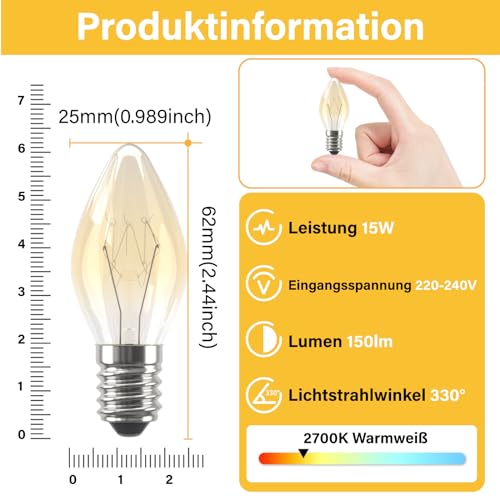 Specification: Luxvista Gloeilampen E14 15W Dimbare C7 Gloeilamp,Warm Wit 2700K Amber Kaars Gloeilamp voor Zoutlamp,Waxbrander 220V, Aromatherapie lamp,Nachtlampje,2 stuks